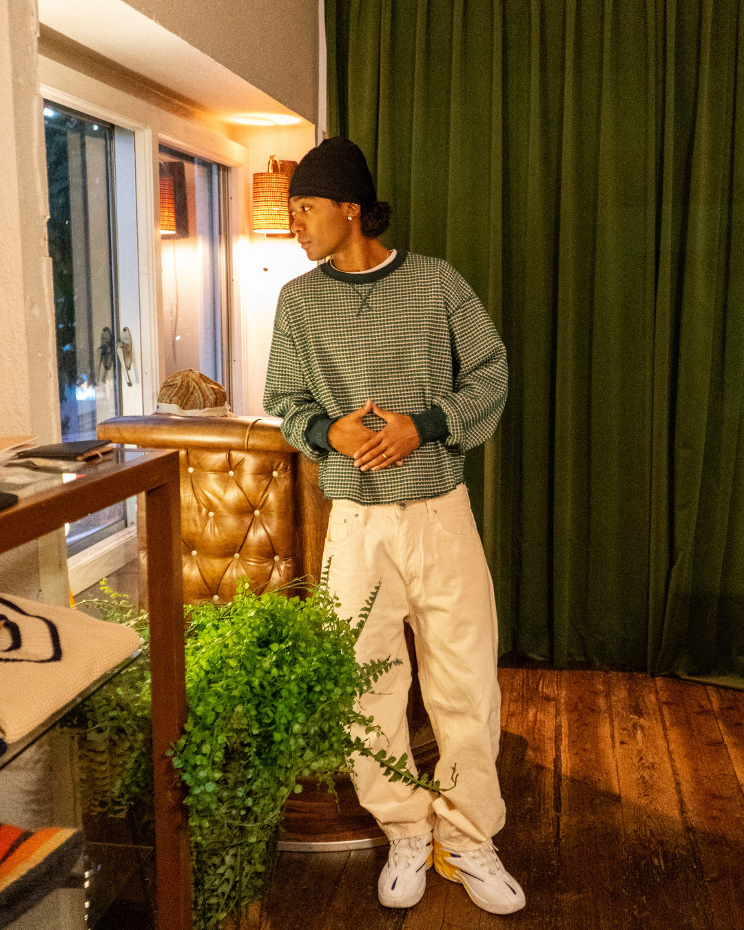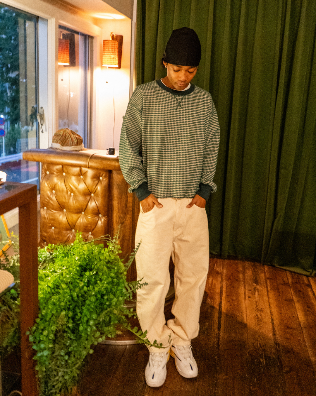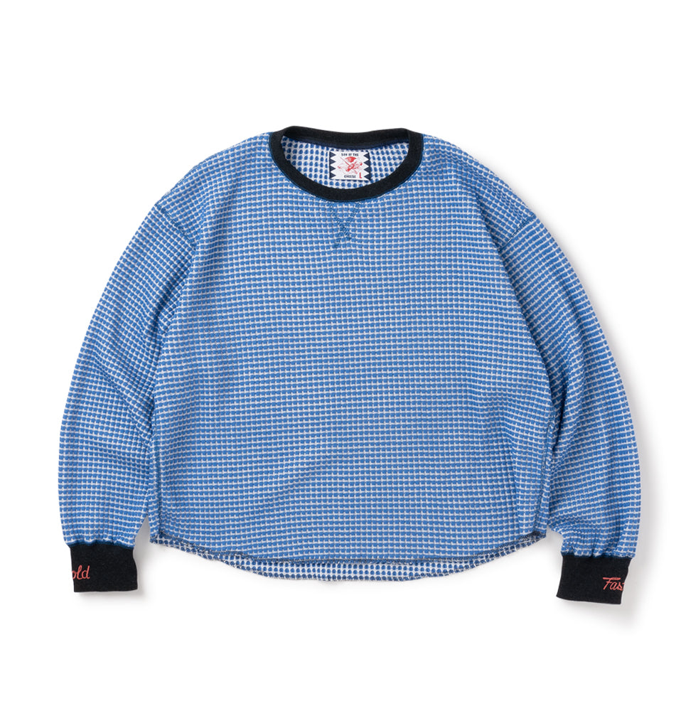 Box-silhouette, slightly-cropped thermal shirt. Features embroidered “HOLD” and “FAST” on the sleeves.