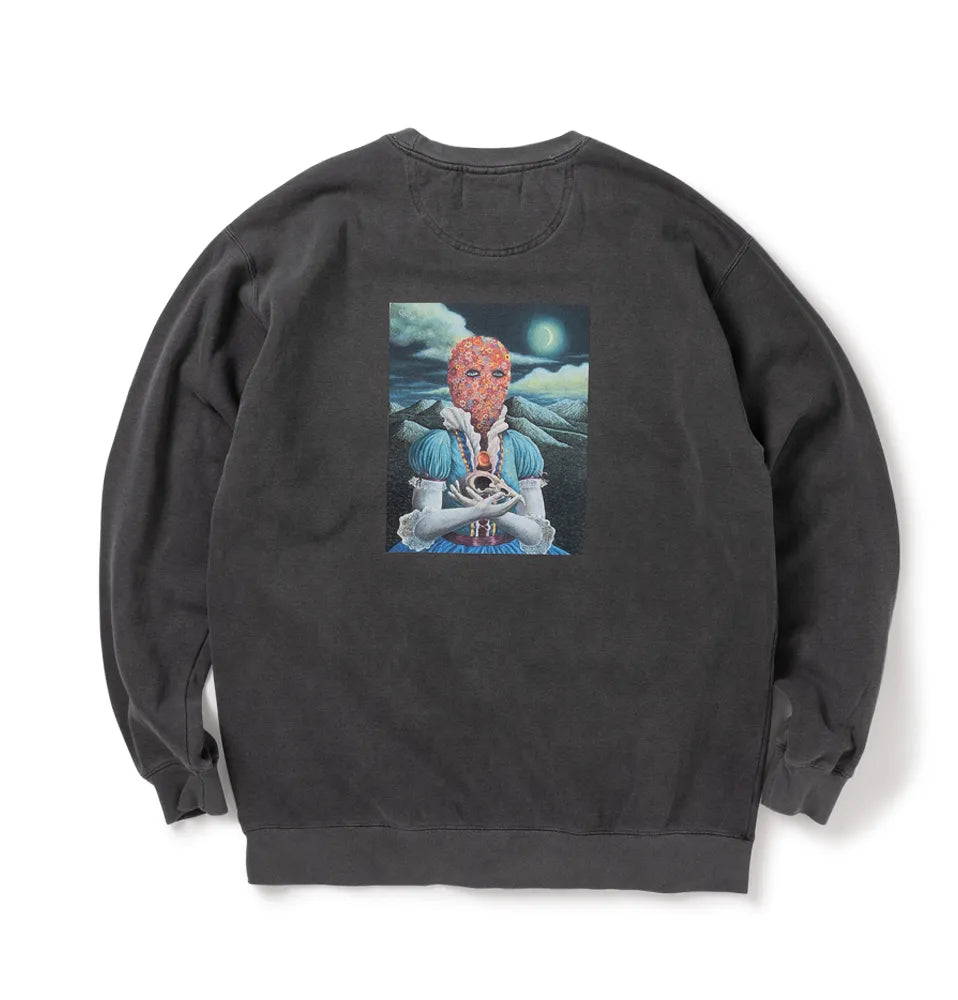 A crewneck sweatshirt featuring Yui Sakamoto's art printed on the back.