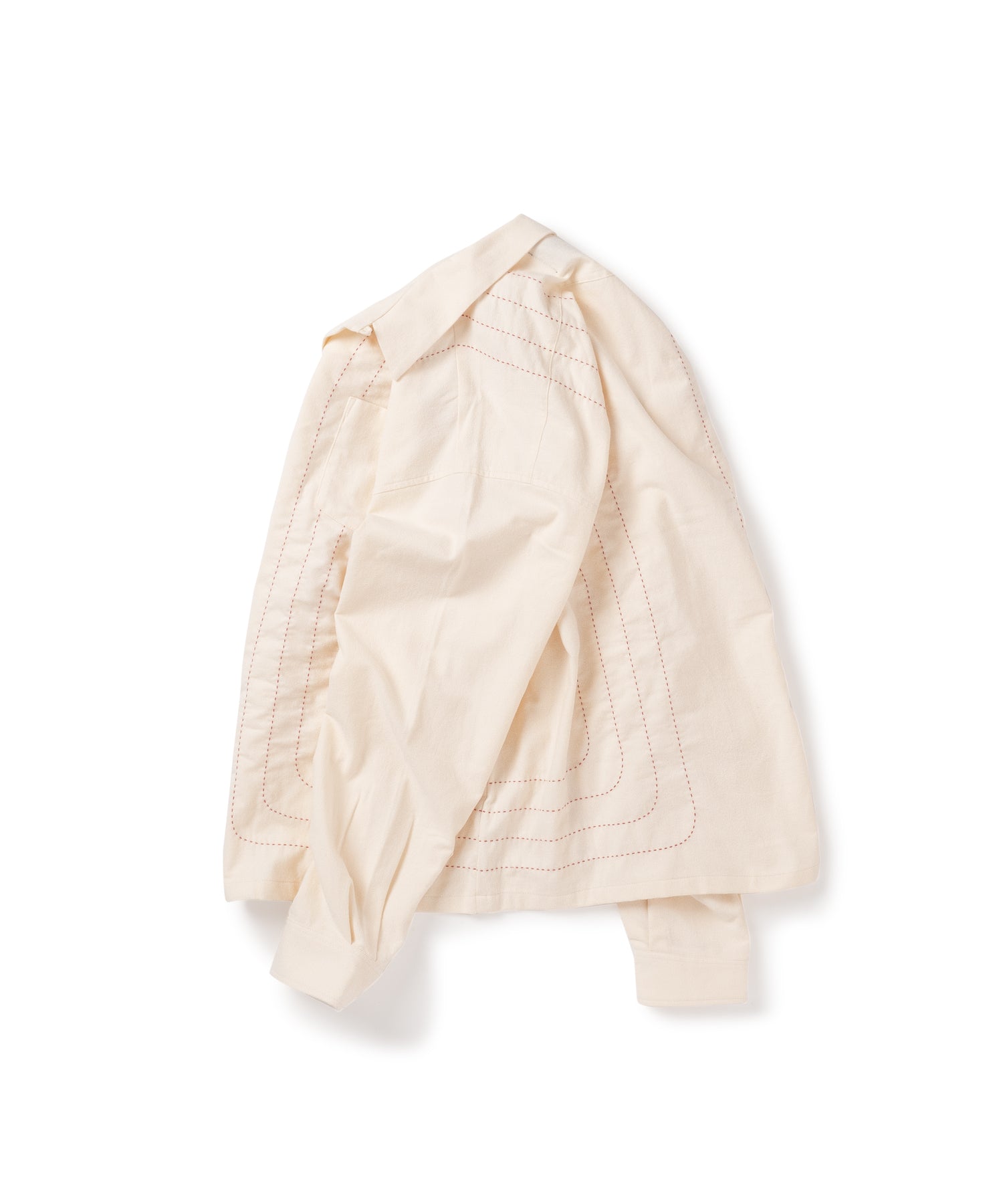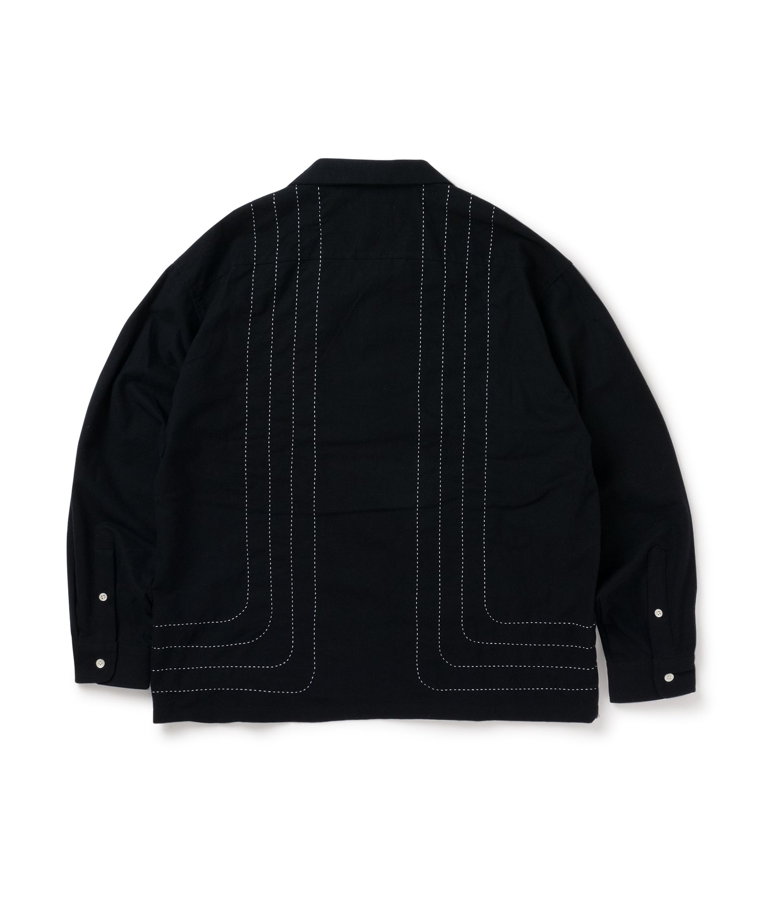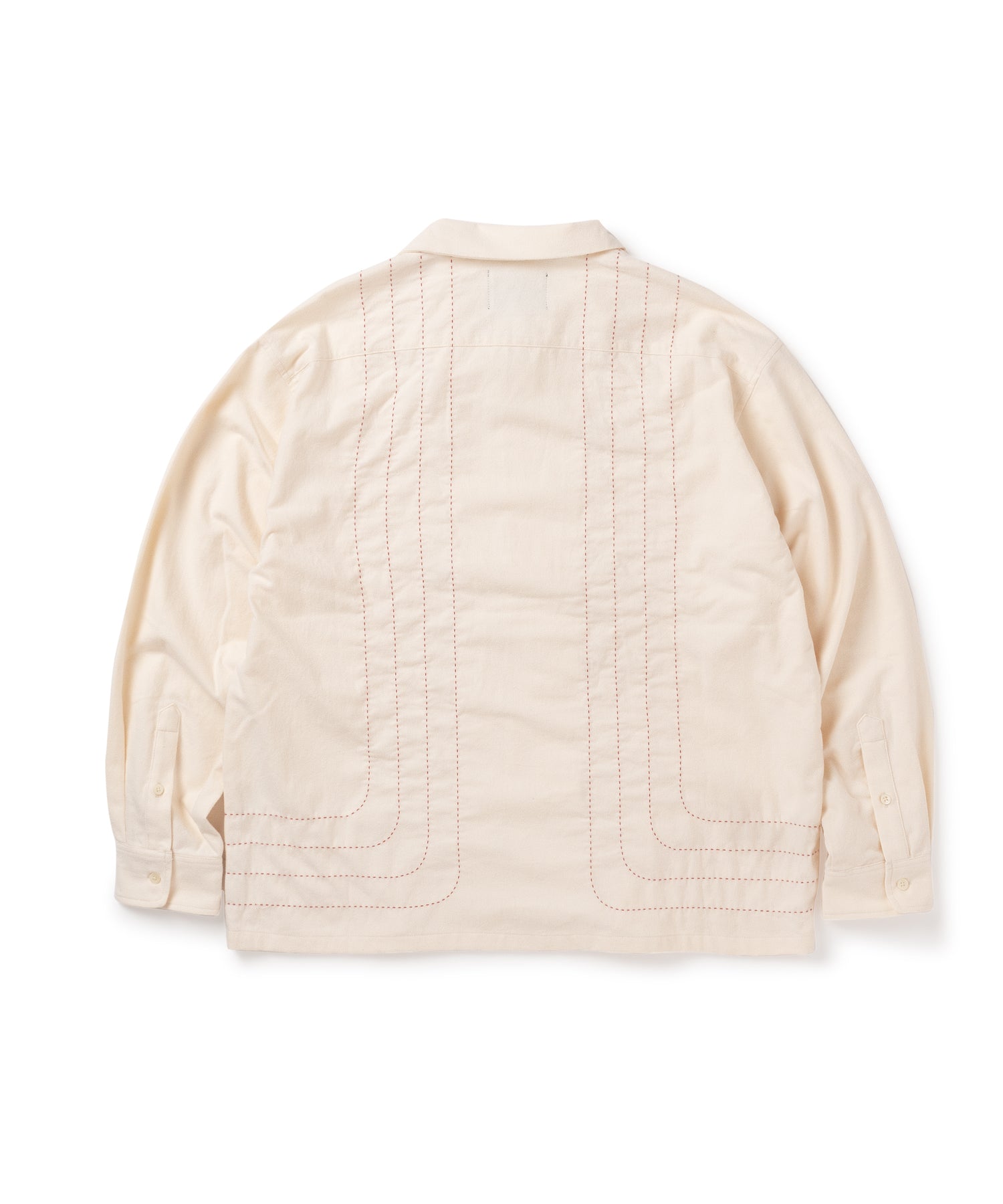 身頃に刺し子風の刺繍を施したオープンカラーシャツ。