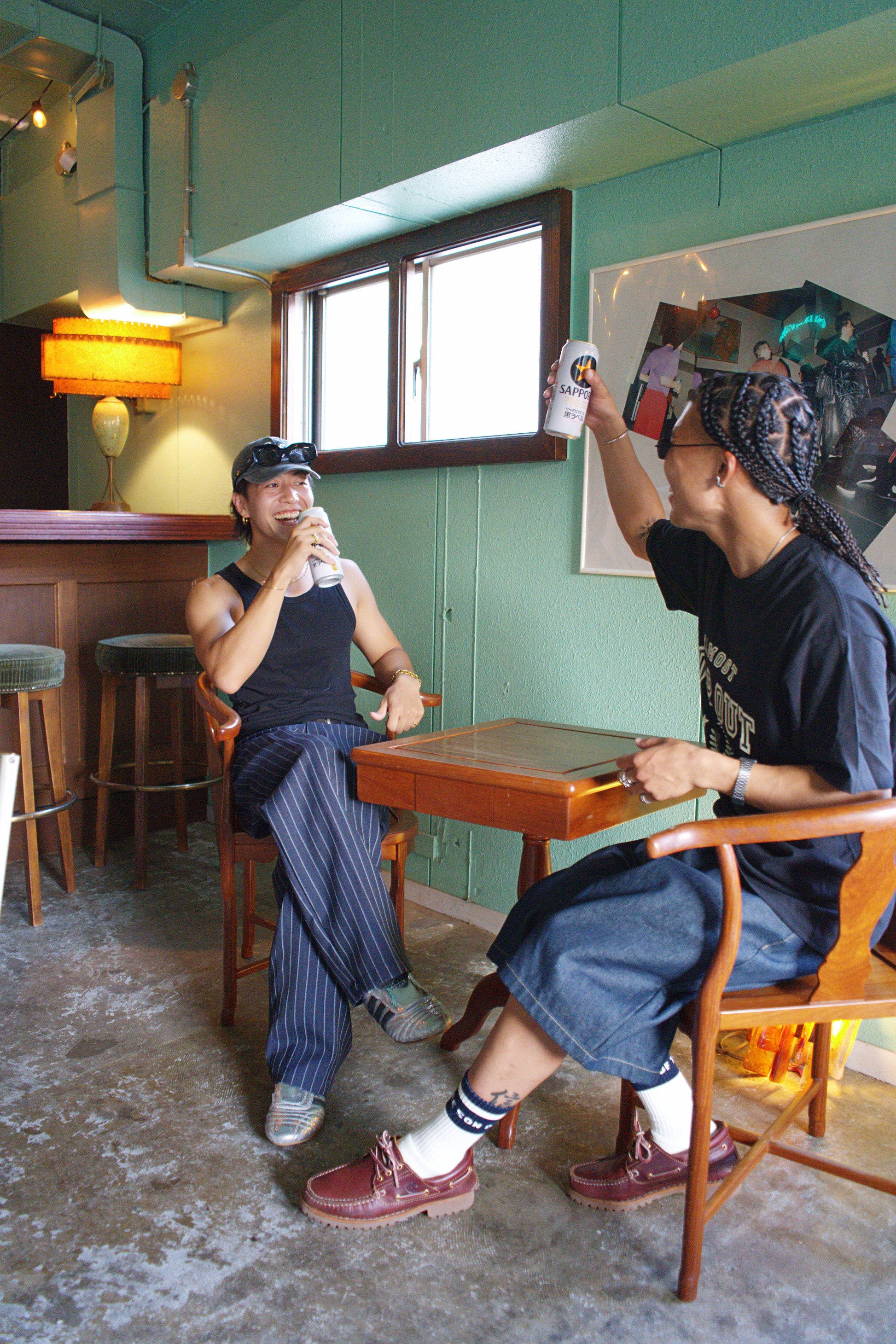 Slacks with a wide silhouette. Made with stripe-patterned kanoko (a traditional Japanese tie-dye) fabric.
