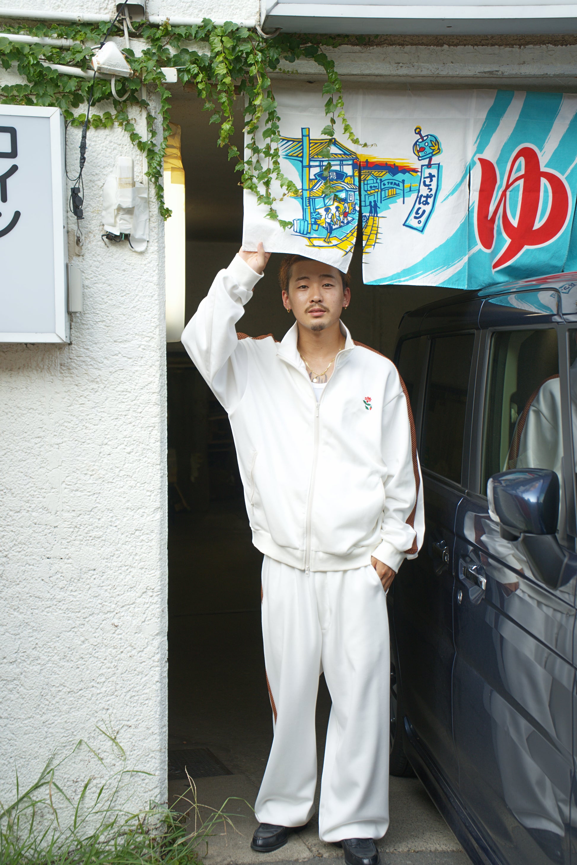 Track pants featuring vintage-inspired fabric panels. Made from soft jersey fabric. Can be worn as a set with the “Track Jkt”.